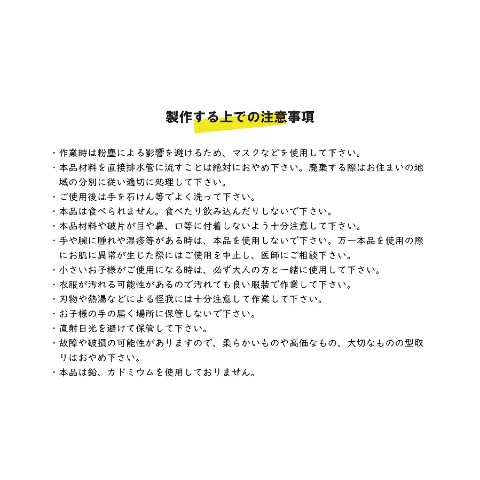 工作材料です。本来の用途以外でのご使用はおやめください。また、口に触れる可能性のある物の作成はおやめください。