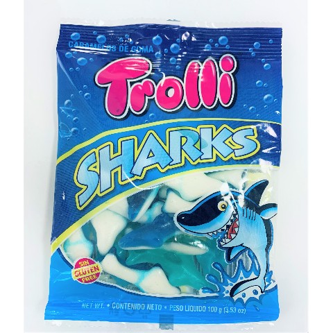 ユニークなサメの形をしたフルーツ&クリームフレーバーのグミキャンディ。
