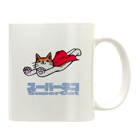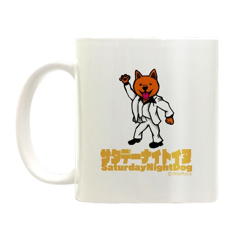 蝶ーP書下ろしキャラクター『サタデーナイトイヌ』と『スーパーネコ』が両方プリントされたマグカップで、サタデーナイトがスーパーほっこりタイム。