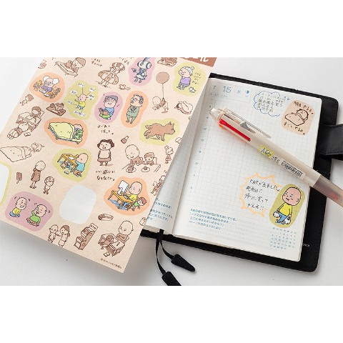 A5サイズのシート状になっているので、真ん中で折って持ち歩くのもおすすめ。ノートや手帳、日記やビンなどをユーモアあふれるイラストで飾りましょう!