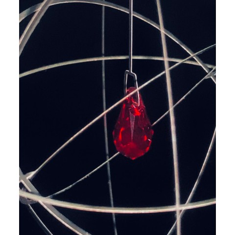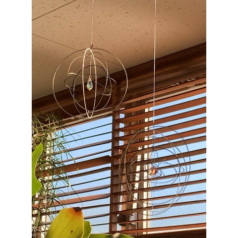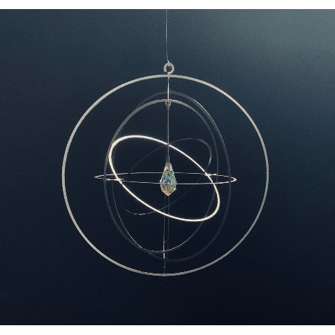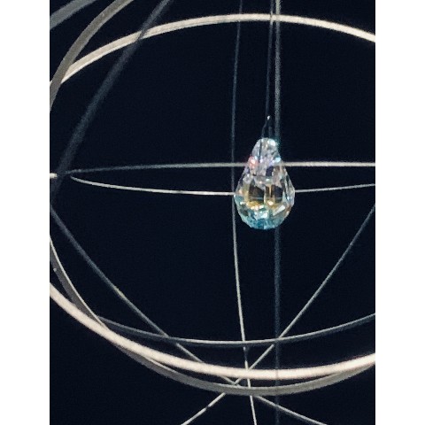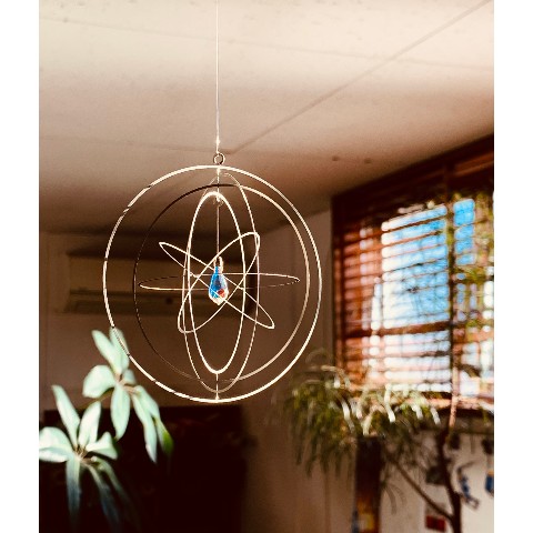 天球儀をモチーフにしたモビールです。5つのリングで球体を表現し、その中に2つのリングが斜めに交差します。中心の空間には雫型のスワロフスキーを配置しました。長さの調節が可能な極細のテグスですので、エアコンや外からの微風でゆっくり回転します。太陽光のあたる窓際だとサンキャッチャーの様に、光が壁などに拡散されます。光源の少ない暗めの空間では、反射したリングのみが見えるので、宇宙空間に浮かぶ様にも見えます。また、大きさが近いものでしたら、他の色などを吊るして見ても綺麗かも知れません。
