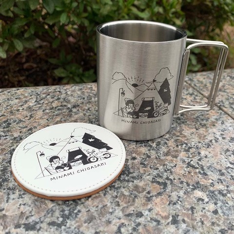 キャンプに持っていきたいステンレスマグ、折り畳みチェア、レザーコースターなどをご用意。