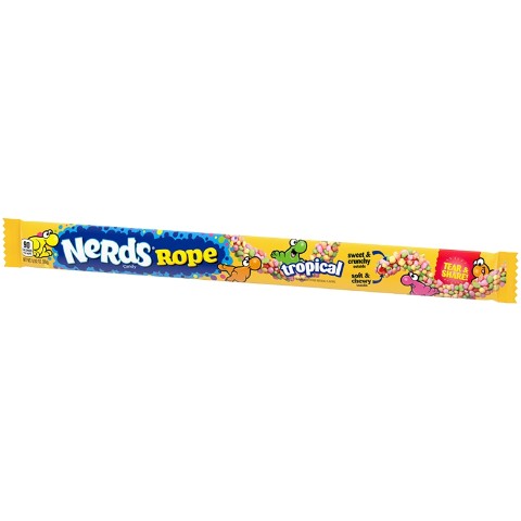 フルーツ味のロープグミの周りにカリカリ、ザクザクなカラフルピースがコーティング。トロピカルフレーバーです。