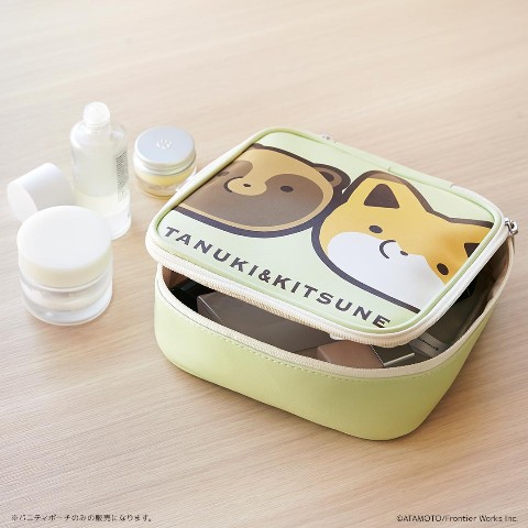 タヌキとキツネの顔が大きくプリントされた可愛いデザインのバニティポーチ。蓋の内側はブラシを収納できる優れもの。メイク道具以外でも、文具・モバイルグッズなどマルチに収納できる便利アイテムです。お部屋用でもお持ち歩き用でも使い勝手のよいサイズ。