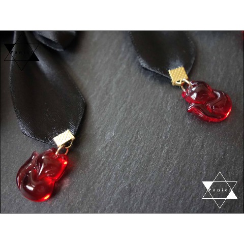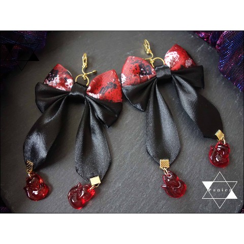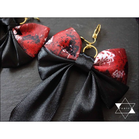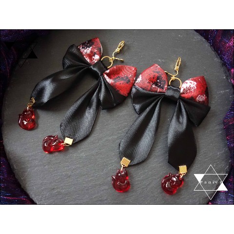 Panierが描き下ろしたオリジナルパターンのリボンを使用したアクセサリーです。リボンの先にはコロンと可愛い狐が鎮座しております。