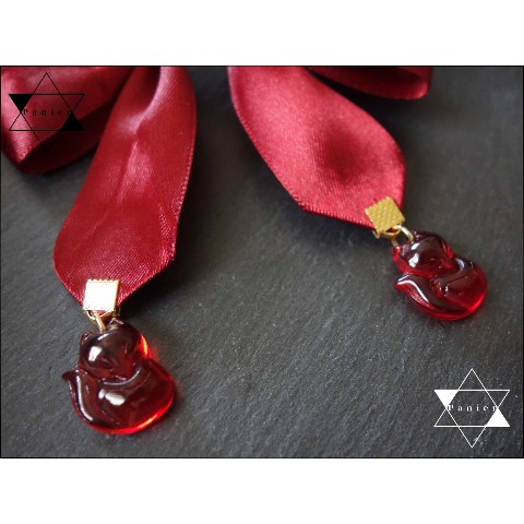Panierが描き下ろしたオリジナルパターンのリボンを使用したアクセサリーです。リボンの先にはコロンと可愛い狐が鎮座しております。