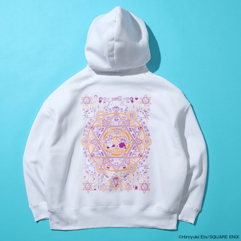 ニケとククリを中心に、登場人物たちや作中に登場するモチーフを魔法陣のようにデザインしプリントしたパーカーです。ゆったりとした大きめシルエットと胸元のニコピョン族のマークがポイント。