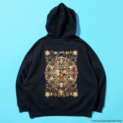 ニケとククリを中心に、登場人物たちや作中に登場するモチーフを魔法陣のようにデザインしプリントしたパーカーです。ゆったりとした大きめシルエットと胸元のニコピョン族のマークがポイント。