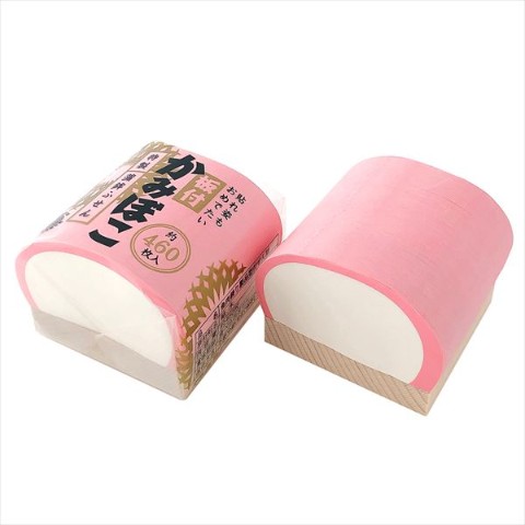 本物のかまぼこ板にくっついているかまぼこそっくりな付箋紙。従来よりも紙色がややクリーム色の上質紙に、紅色のピンクの発色も良くなってリニューアルしました。枚数も450枚から460まいに増えました。縁起のいい紅白の2色をラインナップ。