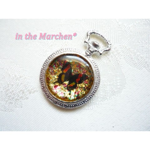 小さな懐中時計型の枠の中に、不思議な淡く発光するような色合いの保存液を流し込んで、珍しい小さな小さな蝶を入れて標本にする・・・そんなイメージで作りました。