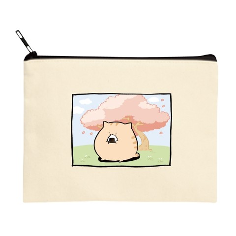 おにぎりもぐもぐ。桜の木の下でにわねこがお花見している一場面が描かれたかわいいポーチ。