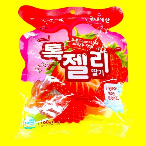 【原材料】果糖ぶどう糖液糖、砂糖、ぶどう糖、濃縮いちご果汁/ゲル化剤(増粘多糖類)、リンゴ酸、香料、クエン酸Na、クエン酸、甘味料(ステビア)、着色料(赤40)