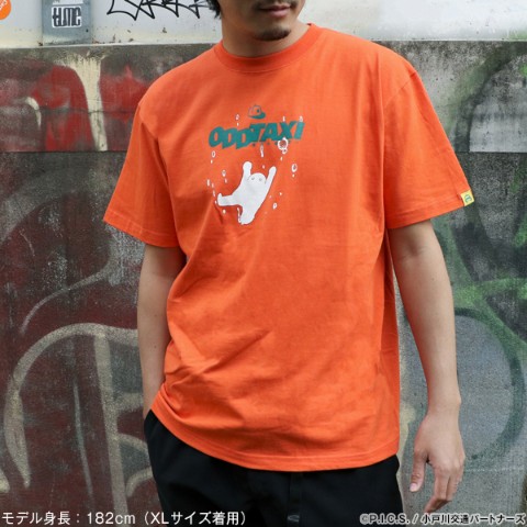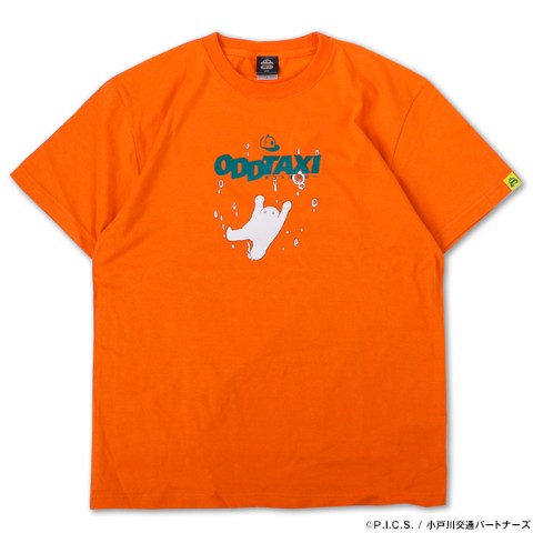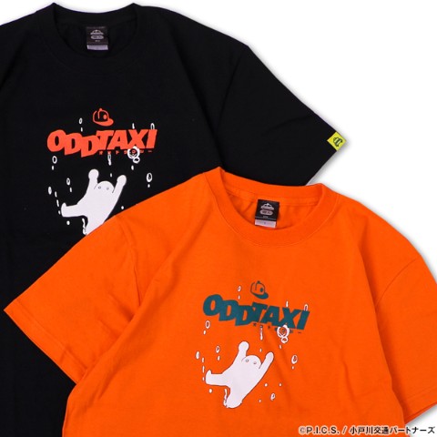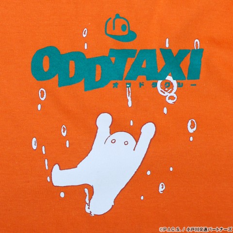 ”アーティストの山田遼志さんが手がけたオープニングアニメから、水中に沈む小戸川のイラストを作品ロゴとともにプリントしたTシャツです。ワンポイントとしてタクシーマークのピスネームを左袖に縫い付けました。