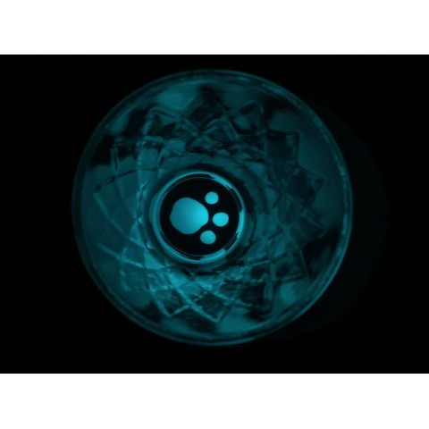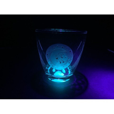 月によりかかったラスカル、グラス底面は青く光る足跡がとても幻想的です。