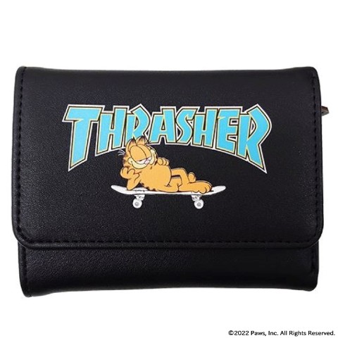 THRASHER×ガーフィールドのコラボレーション三つ折り財布になります。スケボーの上で寝ているガーフィールドのインパクトのあるデザインとなっております。