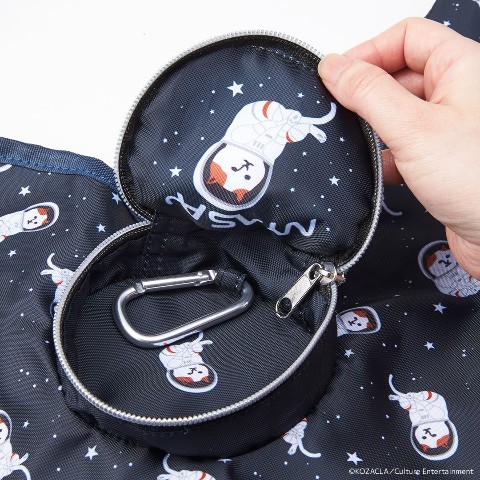 使用時は丸いポーチからバッグを取り出し、使い終わったら畳んでそのままポーチへ収納!ポーチはカラビナ付きで持ち運びにも便利です。