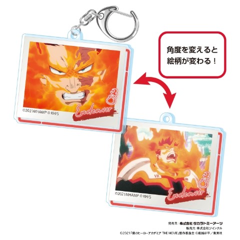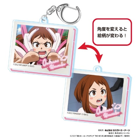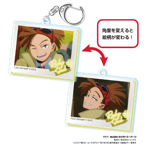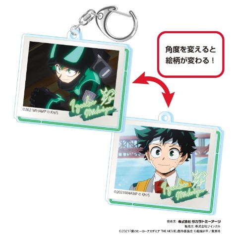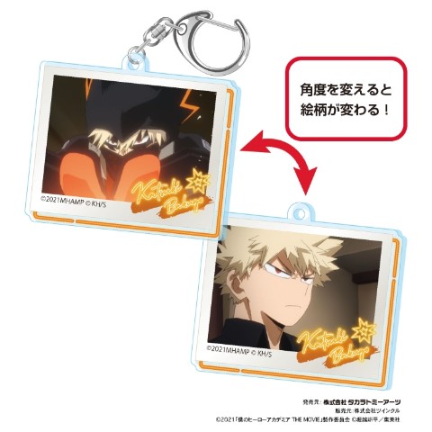 『僕のヒーローアカデミア THE MOVIE ワールド ヒーローズ ミッション』の場面写を使用した、レンチキュラーで絵柄の変わるキーホルダーです。
