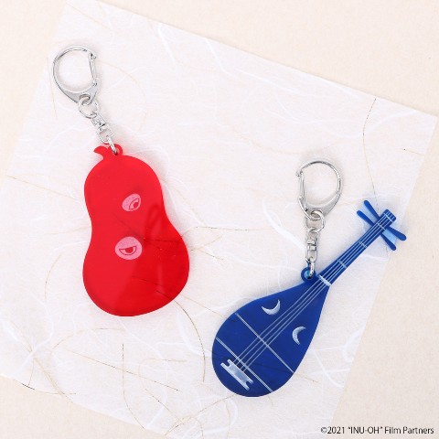 犬王のひょうたん面と友魚の琵琶を象ったアクリルキーホルダーです。厚さ5mmで存在感のある仕上がりです。