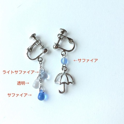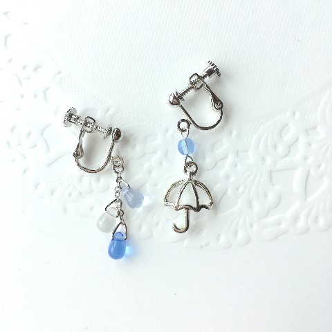 雨の日にもちょっと気分を上げる♪傘と雨粒のイヤリングです。