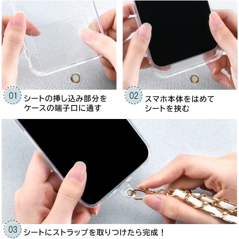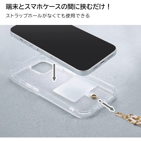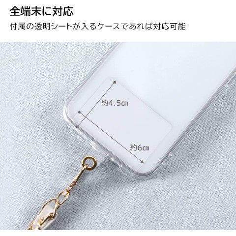 透明シートを挟むだけ!全端末対応。端末とスマホケースの間に挟む透明シート同梱。長さ調整不可。ストラップ全長約120。