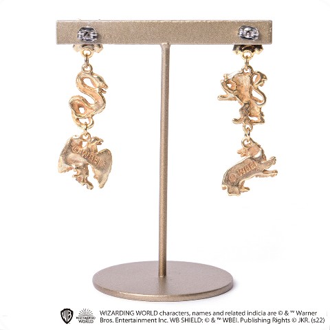 ホグワーツ魔法魔術学校の頭文字と、4つの寮を象徴する動物をモチーフにしたピアス。動物の配置は校章とリンクしており、左上から反時計周りに「グリフィンドール/ライオン」、「ハッフルパフ/アナグマ」、「スリザリン/サーペント(大蛇)」、「レイブンクロー/ワシ」があしらわれています。全体のカラーを落ち着きのあるゴールドで仕上げました。耳元を上品に彩ります。