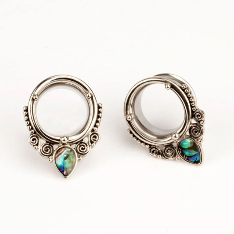 ダブルフレアタイプのホールピアスにドロップ型のモチーフが付いた、女性らしいBODYpieace