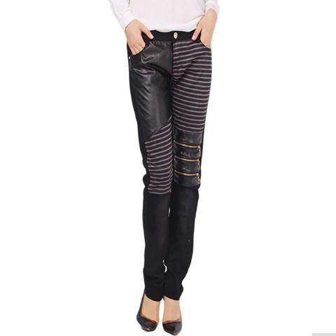 色味の異なったピーチ起毛のボーダーや、レザー調の素材が切り替えられたギミックレギンス。
