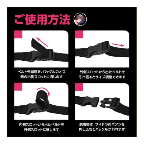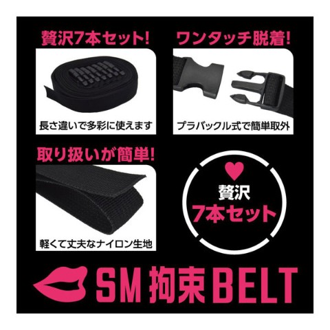好きなあの子をいいなりに……。これひとつでSMプレイの拘束を簡単にする、ボンデージ用ベルト7本セット「SM拘束BELT」!SMプレイの核心となる「拘束」を、とってもお手軽にするSMアイテムです。ワンタッチで装脱着できる、バックル式のナイロンベルトです。クルッと巻いてカチッと装着、アジャスターからベルトを引っ張ってサイズ調整すれば、しっかり適切の拘束緊縛。ベルトは、ナイロン素材で強度もばっちりの頑丈仕様。バックルは、サイドリリースバックルの差し込むだけで装着&サイドボタン押すだけで脱着の簡単仕様。アジャスターでサイズ調整できますので、場所を問わずにぴったりフィットします。長さ違いの7本セットですので、様ーな場所を拘束出来ます。手枷、足枷、頭枷、胴枷、太腿枷、と多彩な拘束バリエーションとなります。さらに、家具に縛り付けたり、おもちゃを固定したりなどの使い方もOK!クルッ&カチッと巻くだけで簡単に拘束プレイを楽しめます!