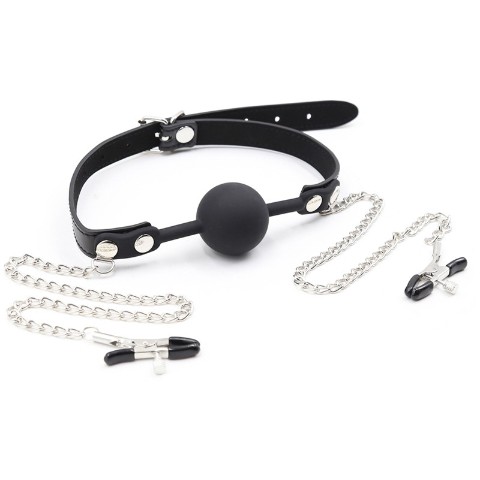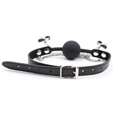 簡単な拘束感が味わえることで人気のボールギャグとニップルクリップが一体となった辱めアイテム。口枷で拘束されながら感じやすい乳首をつまんだまま放置して恥ずかしい姿を鑑賞してもよし、ほかのアイテムと合わせて使用してもよし、想像力をフル活用してお互いの興奮度をMAXに!柔らかく弾力のあるゴムで覆われている先端は、はさむ強さを調整出来るので痛すぎる心配はありません。※本品はジョークグッズとなります。その他の目的でご使用された際の責任等は一切負いかねますのでご了承ください。素材:合皮、金属カラー:ブラック
