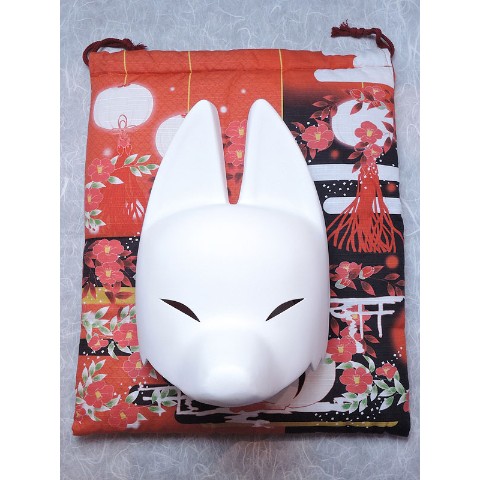 生地は綿を100%使用したシャンタンと言う織り方で、風呂敷などにも使われます。軽やかで、和風の風合いを出すのに適している生地です。巾着の内部には綿が仕込まれていて、衝撃を吸収しやすくなっています。狐面を持ち運びたい際の入れ物としてご利用いただけます。