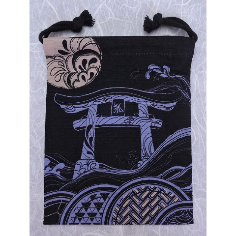 描かれているのは、月光に照らされ波打つ海には大きな鳥居。そしてもう片面を彩る和柄の数々…繁栄や長寿の「青海波」に、円満や調和の「七宝模様」、福を絡めとる「網目」、そして「矢絣」、「鱗」、「三崩し」…伝統的な模様の数々を揃えました。