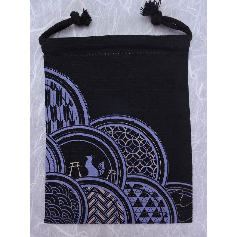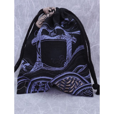 そのW.無色氏に狐面を入れるための巾着をデザインをしていただきました。生地は綿を100%使用したシャンタンと言う織り方で、風呂敷などにも使われます。巾着の内部には綿が仕込まれていて厚みがあり、衝撃を吸収しやすくなっています