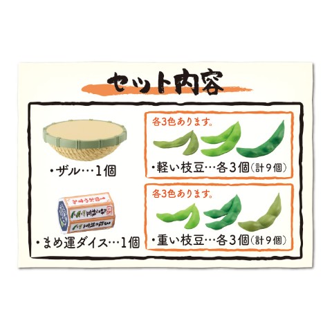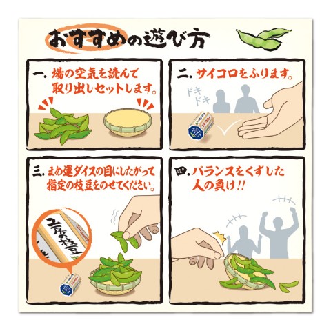 ・グラグラするザルの上にえだまめを積んでいって、崩した人が負けのドキドキバランスゲームです。