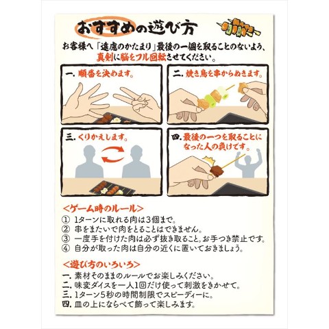 順にやきとりを串からはずしていき、最後の1個を取った人が負けになるゲームです。