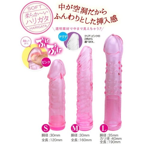 この柔らかさがクセになる? 今まで無かった中身が空洞で柔らか ̄いハリガタの登場です! 程よい硬さを保ちつつ、ぷにぷにとした柔らかさを併せ持つ唯一無二のハリガタに仕上がりました。 中身が空洞の為、非常に軽く女性でも簡単に扱えます。 日本のハリガタ職人が1本1本手造りし、この柔らかさは日本ならではの『優しさ』を表現しています。 透明感のあるスケルトンカラーで、挿入すると中まで見えちゃう?なんて楽しみ方もできます。 S、M、L、ア●ルと初心者から上級者まで楽しめるシリーズ展開も魅力です! 日本製