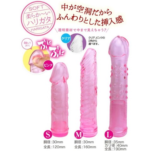 この柔らかさがクセになる? 今まで無かった中身が空洞で柔らか ̄いハリガタの登場です! 程よい硬さを保ちつつ、ぷにぷにとした柔らかさを併せ持つ唯一無二のハリガタに仕上がりました。 中身が空洞の為、非常に軽く女性でも簡単に扱えます。 日本のハリガタ職人が1本1本手造りし、この柔らかさは日本ならではの『優しさ』を表現しています。 透明感のあるスケルトンカラーで、挿入すると中まで見えちゃう?なんて楽しみ方もできます。 S、M、L、ア●ルと初心者から上級者まで楽しめるシリーズ展開も魅力です! 日本製