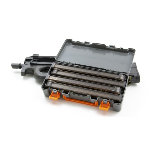 小さく見えますが、東京マルイなどから販売されている電動ガン「P-90」のマガジンが 4 本ぴったりと収納できるサイズです。