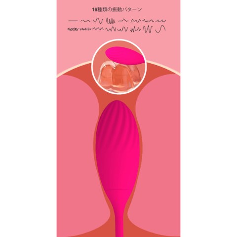 16種類の振動パターンを搭載。先細りの楕円形にくびれた形状(溝)。リモコンを使用することで遠隔操作が可能です。USB充電ケーブルで本体に充電します。IPX5防水なので使用後に直接に水洗いすることができ、衛生面を確保することができます。