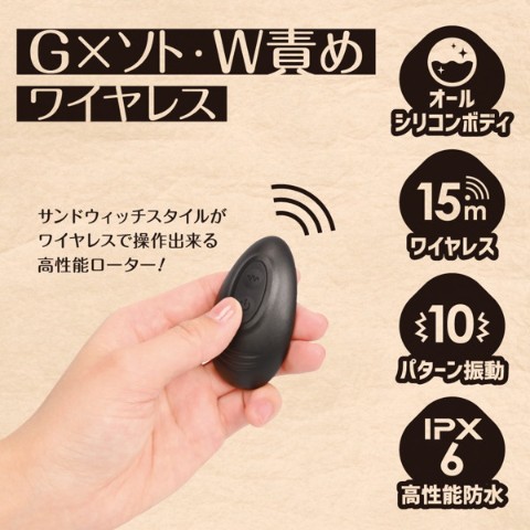 Gとソト、どっちも同時責め出来るシリコンワイヤレスローター。中と外を挟み込むようなサンドウィッチスタイルにWモーター搭載。10パターンの振動を最大15M(※使用環境により大幅に増減します。)のワイヤレス操作が可能です。ローター本体はオールシリコンボディでIPX6の高性能防水性能だからしっかり洗えて衛生的に遊べます。精密設計による静音振動で周りを気にせずストレス無く楽しんで頂けます。リチウムイオンバッテリー搭載で満充電90分で最大60分使用可能(※使用環境により大幅に増減します。)