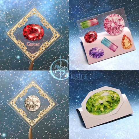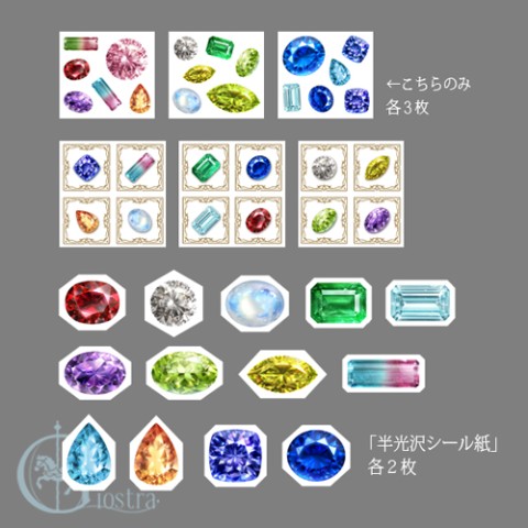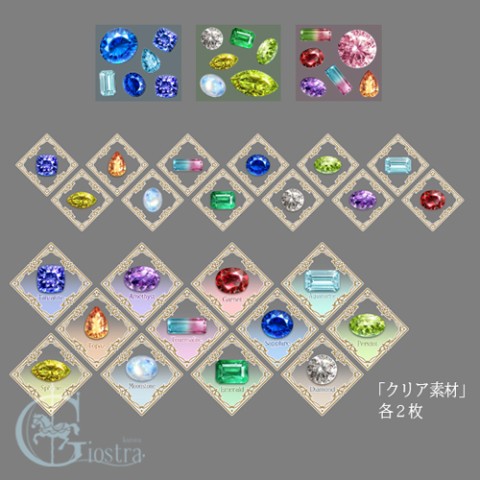 宝石の種類は1~12月の誕生石で、ガーネット、アメジスト、アクアマリン、ダイヤモンド、エメラルド、ムーンストーン、スフェーン、ペリドット、サファイア、トルマリン、トパーズ、タンザナイトの12種類です。