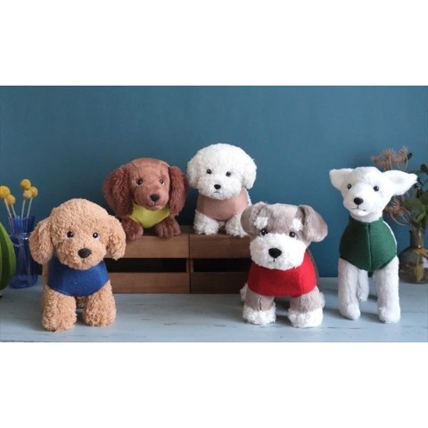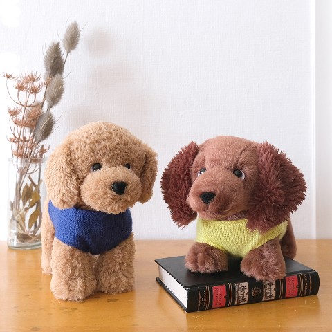 見つめられているような表情デザインは、まるで犬とコミュニケーションをとっているかのよう。ポップなカラーのセーターを着た、おしゃれなわんちゃんのぬいぐるみシリーズです。