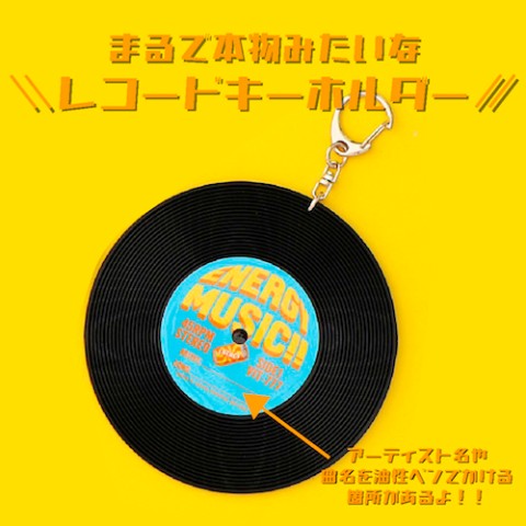 ビビビビット!!オリジナルデザインのレコードキーホルダーです!まるで本物のレコードみたいに溝もはいっています。デザインの真ん中あたりには曲名やアーティスト名を油性ペンで記入できる箇所がございます。是非とも自分の推しアーティストを記入して、推しアピとしても使用してください。サイズも10とキーホルダーとしては大きめなので、カバンにつけるだけでインパクト抜群です。