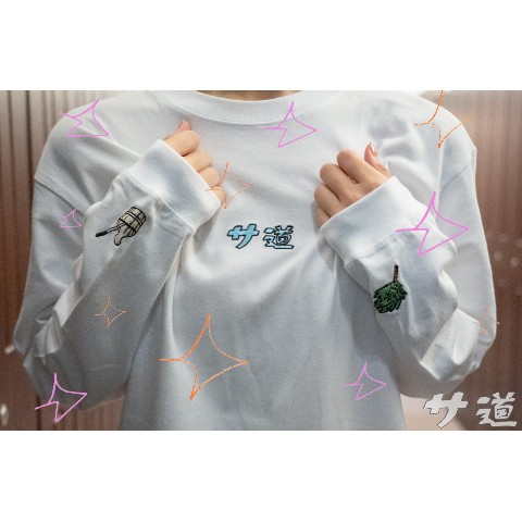 胸にサ道と両袖部分には可愛いサウナを表現した刺繍を入れたユニセックスで着れるサ道ロングスリーブTシャツ。