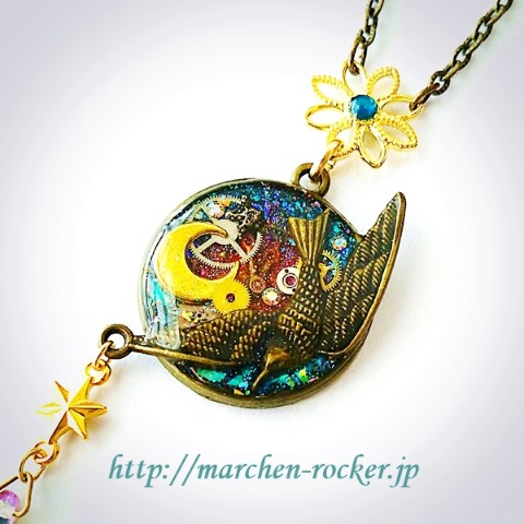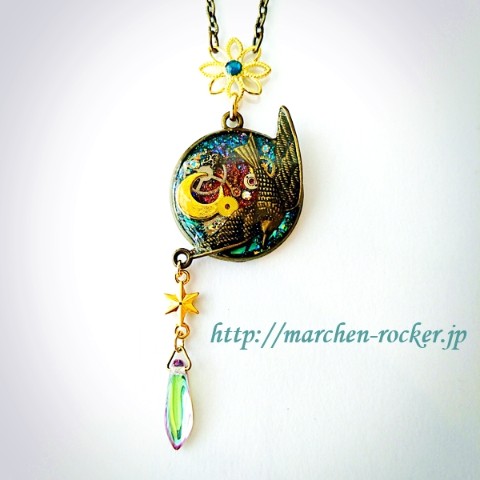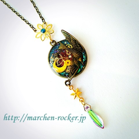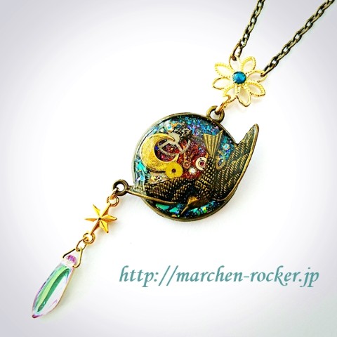 羽ばたく鳥、三日月、時計の歯車等を組み合わせたスチ-ムパンクな雰囲気のネックレスです。