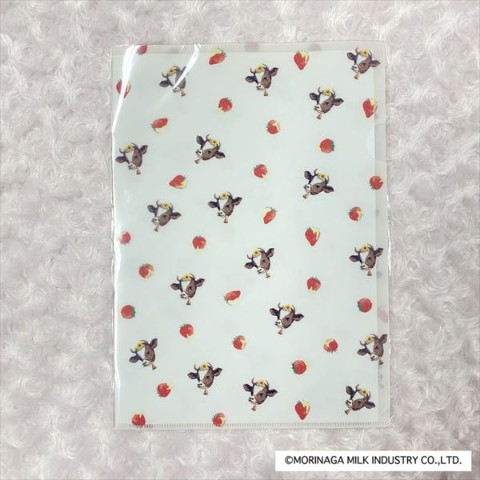 森永のれん乳で有名な牛といちごがまだらにデザインされたかわいいA4クリアファイルです。