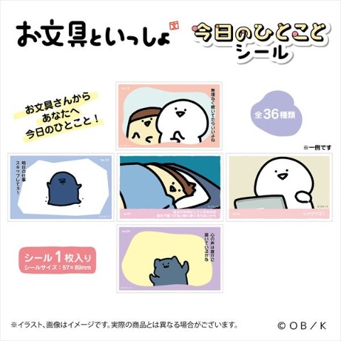 お文具さんとその仲間たちの日常を綴った動画や4コマがSNSで大人気のキャラクター「お文具といっしょ」のシールです。パッケージを開けると全36種のうちどれか1種のシールが1枚入っています。携帯電話のカバーの内側に収まるサイズなので、お気に入りはぜひ収納してください?