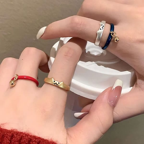 猫のお顔が描かれたリングと赤い首輪のリングのセットです♪