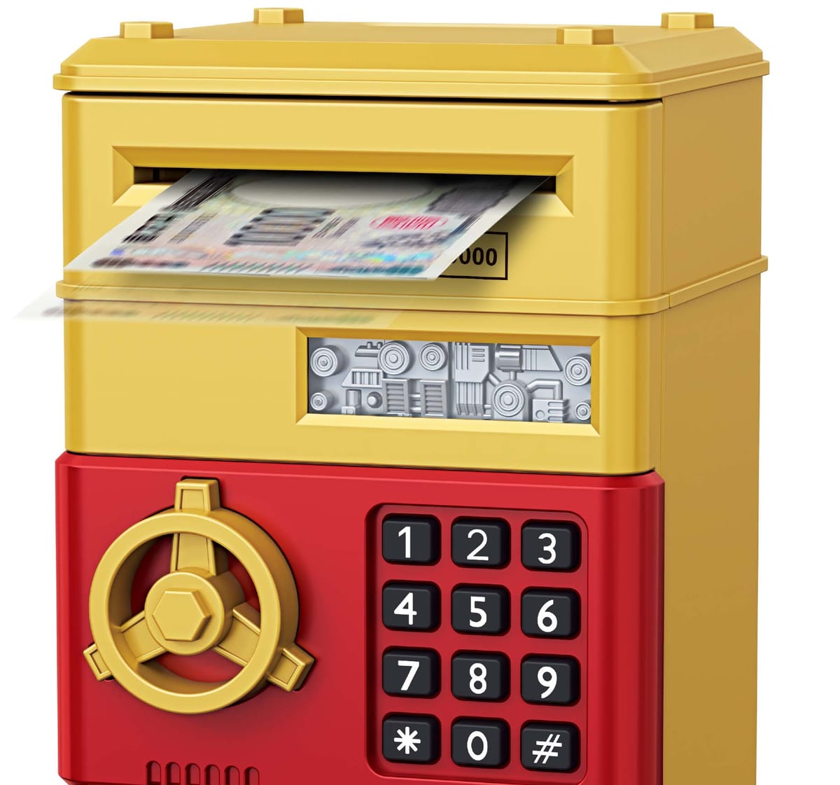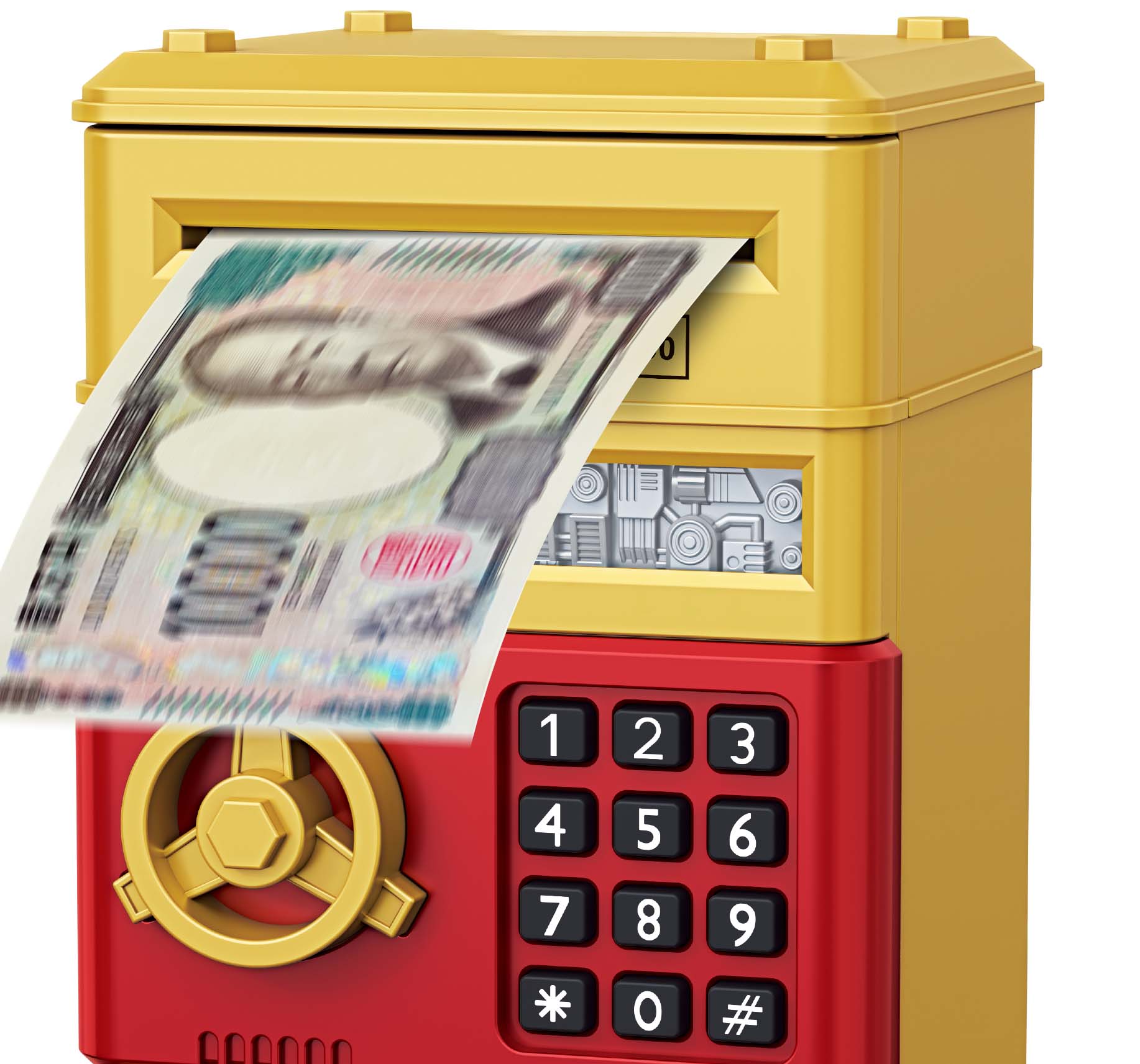 硬貨と紙幣が投入可能で、紙幣投入口は電動式の貯金箱です。