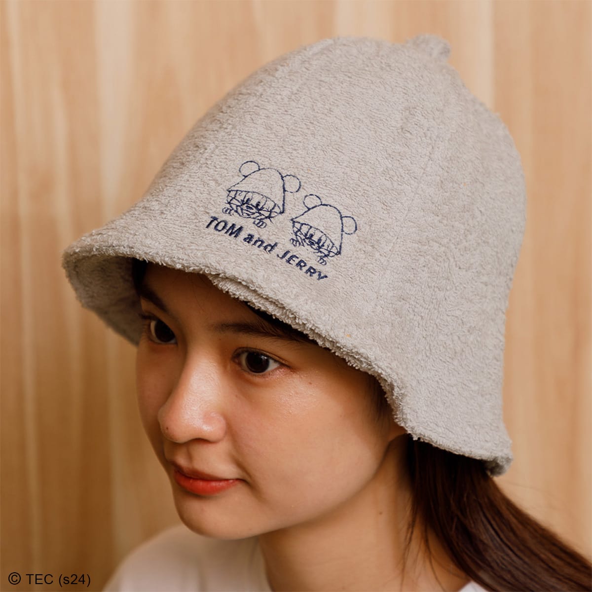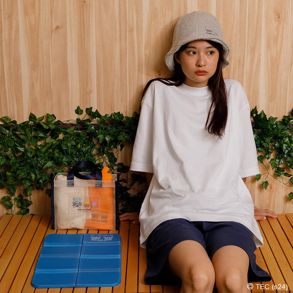 サウナハット・サウナマット・サウナバッグの3点セット。トム、ジェリー、タフィーがサウナハットをかぶってサウナを楽しんでいる特別デザイン。
