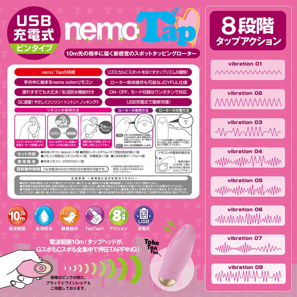 タップでトントン!もみもみ押してバイブでほぐす、指圧の魂を継承したリモコンローターの登場です。振動するローターから突起が飛び出てGスポをトントンつついちゃう指圧の刺激。手のひらサイズでバイブ振動ともみもみ指圧のW刺激が気持ちいい。リモコンでもローター単体でも操作可能。8種類の動作パターン。本体の表面はソフトシリコンで肌ざわりもすべすべ。・USB充電式・フル充電で最大40分可動・生活防水。≪ご使用上の注意事項≫1:リモコン付属の電池と予備の電池は動作確認用です。お早目に新しい物にお取替え下さい。2:振動させていなくてもローターは電波受信の為に電池を消費しています。使用後は必ず電源をOFFにして保管して下さい。3:リモコン用電池の絶縁体を取り外してからご使用ください。4:ローターを無理に動かしたりすると故障する恐れがあるのでおやめください。